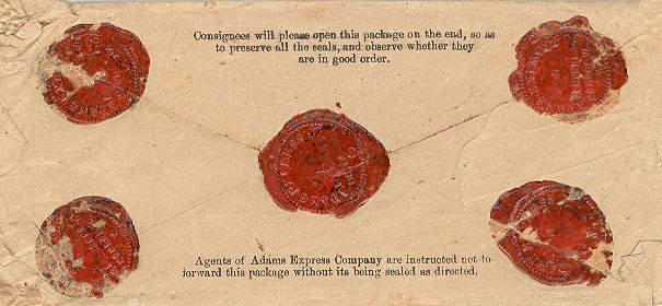 Adams Express Envelope, front and back, likely sent on July 15 or 16, 1864 by William, while he was in the Chesapeake Hospital, to Maggie and containing $150.00