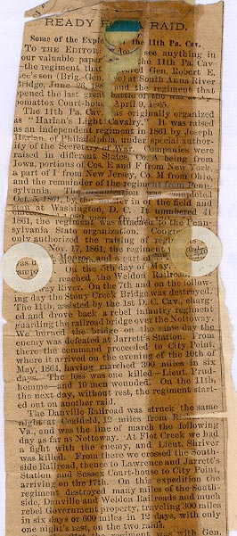Newspaper article titled "READY FOR A RAID", Some of the Exploits of the 11th Pa. Cav. Unknown newspaper (likely in Philadelphia) and certainly written soon after August 17th, 1865. For the context here, the text for the key part of the article is as follows: "At the battle of Five Forks, on April 1, 1865, the regiment had the advance of the division, which was ordered to attack on the extreme right of Gen. Sheridan's forces. A charge was at once made and the enemy driven from his position. This was not achieved without heavy loss. Maj. Monroe and Capt. Lancaster were killed, Lieut. Mathews mortally wounded and Col. Spear wounded." |