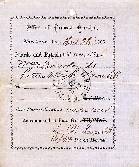Official Pass for Maggie to recover William's body from the battlefield